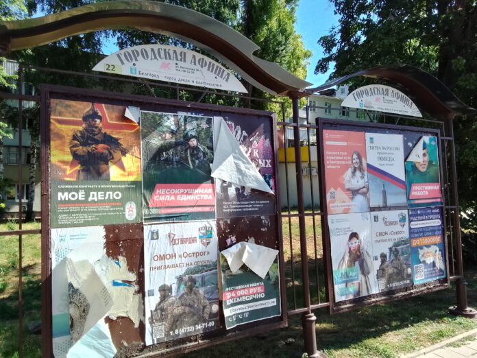 Реклама войны буквально везде: «Мое дело. Служба по контракту в вооруженных силах», «Несокрушимая сила единства. Служба по контракту РФ», «ОМОН ОСТРОГ приглашает на служба», «Престижная работа. Служба по контракту». Среди баннеров рекламы военной службы можно заметить редкие плакаты с рекламой кредита на поддержку бизнеса.