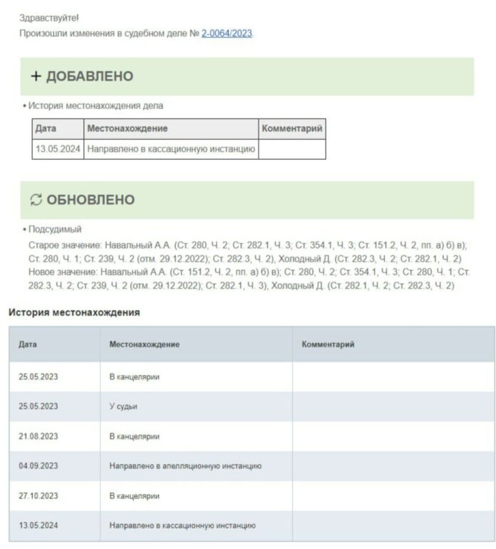 На информацию об изменении в карточке дела обратила внимание SOTAvision. Из нее следует, что 13 мая дело было направленно в кассационную инстанцию.