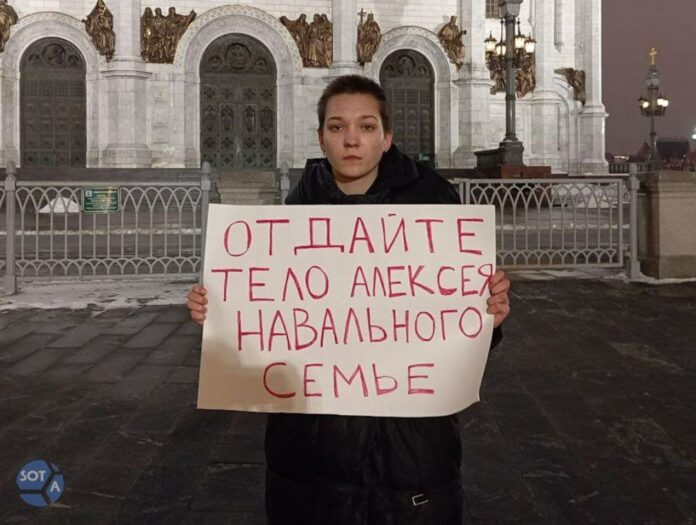 Девушка встала в одиночный пикет около храма Христа Спасителя с требованием передать тело сына Людмиле Навальной.
