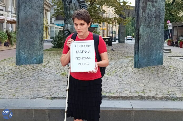 Активистка Оксана Осадчая вышла на Старый Арбат в Москве с пикетом в поддержку журналистки Марии Пономаренко