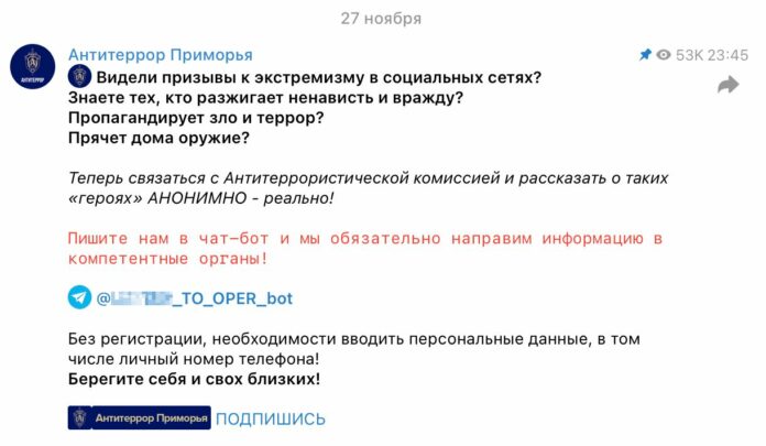 Антитеррористическая комиссия Приморского края запустила чат-бот для доносов