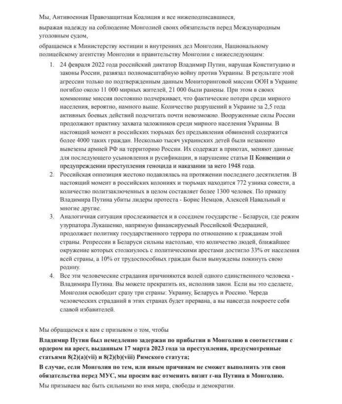 Российская антивоенная правозащитная коалиция создала петицию, подписанты которой призывают правительство Монголии, Министерство юстиции и внутренних дел и Национальное полицейское агентство выполнить обязательства Монголии перед Международным уголовным судом (МУС), юрисдикцию которого признает страна, и арестовать Владимира Путина.