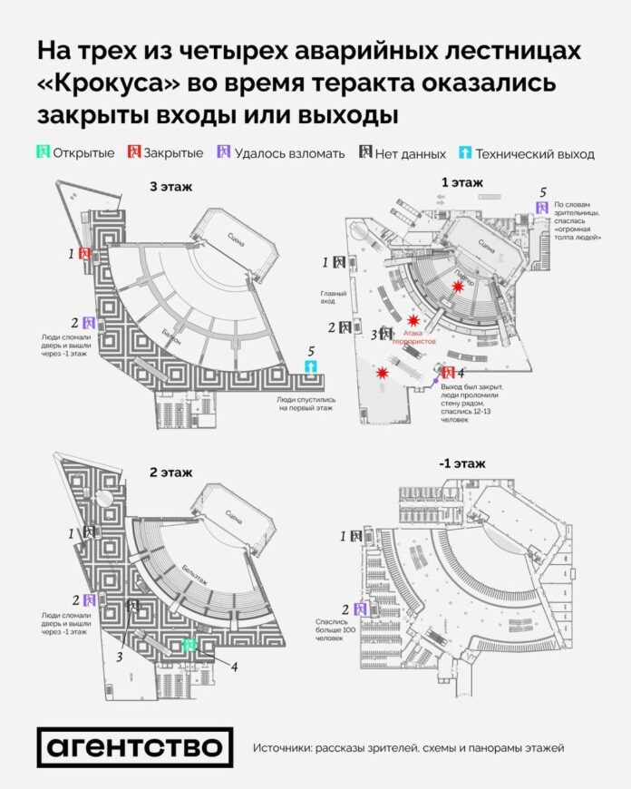 В здании во время теракта минимум на трех из четырех эвакуационных лестниц выходы были заперты. При этом по крайней мере у одной лестницы на верхних этажах были закрыты сразу обе лестницы, выяснили журналисты издания «Агентство» из беседы с семью зрителями концерта и данных открытых источников