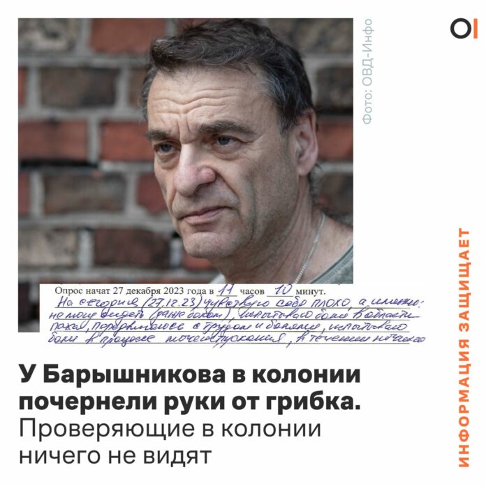 По данным ОВД-Инфо, руки Барышникова почернели из-за поражения грибком, которым он заразился из-за условий содержания в колонии.