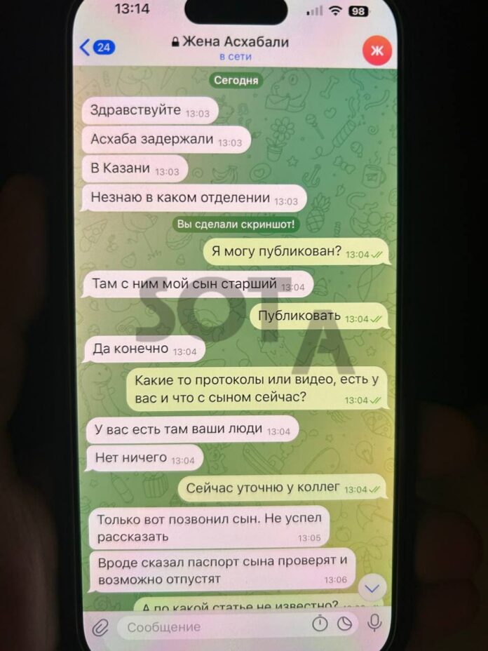 Жена Асхаба Алибекова сообщила, что ее мужа задержала полиция по прибытии на поезде в Казань 19 февраля, о чем стало известно благодаря звонку их сына в 23:45. Точные обстоятельства и причины задержания пока неизвестны.