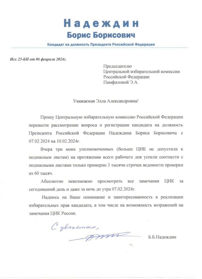 Ранее в ЦИКе планировали рассмотреть вопрос о регистрации Надеждина на заседании 7 февраля.