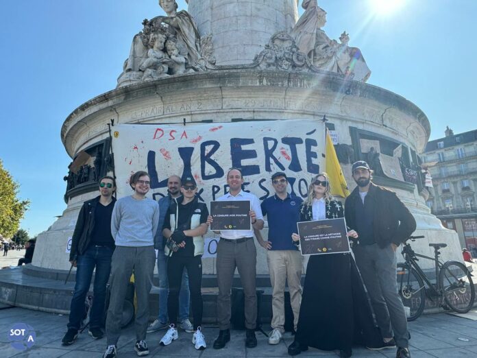 Его организовали представители Либериарианской партии Франции. Мероприятие прошло на площади Республики в Париже. Участники митинга принесли с собой плакаты, на которых были написаны лозунги: «Цензура помогает Путину» и «Цензура — метод тиранов, как Путин».