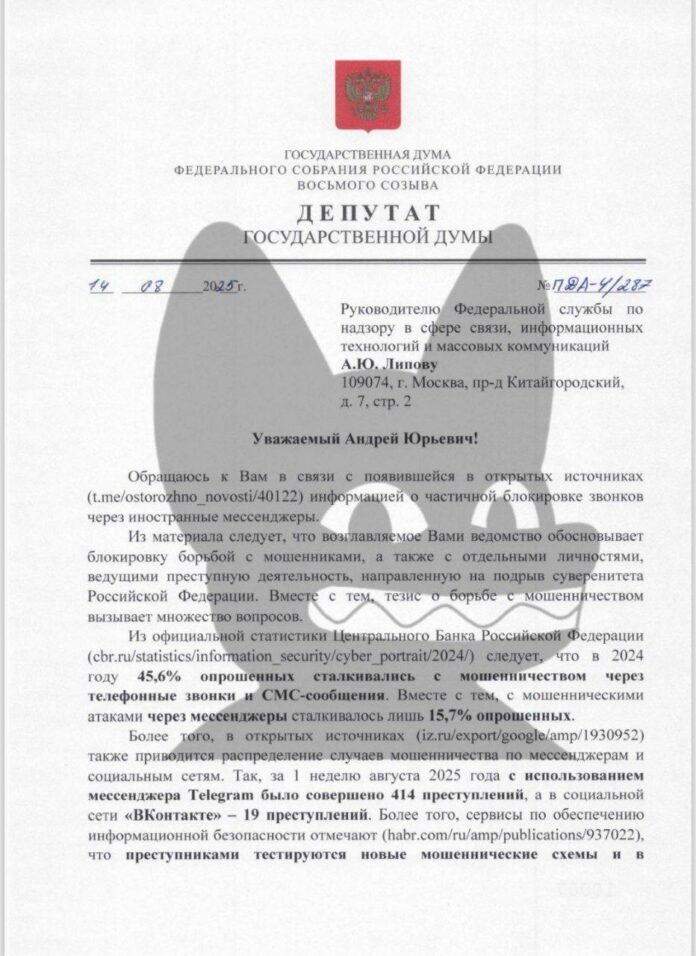 В тексте обращения парламентарий ссылается на статистику ЦБ за прошлый год, согласно которой 45% опрошенных россиян сталкивались с мошенничеством через телефонные звонки и SMS, через мессенджеры — только 15%.