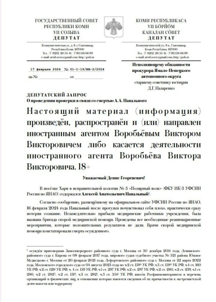 НовостиДепутат Государственного Совета Республики Коми Виктор Воробьев отправил запрос прокурору ЯНАО на... Новости Депутат Государственного Совета Республики Коми Виктор Воробьев отправил запрос прокурору ЯНАО на проведении проверки обстоятельств смерти Алексея Навального Sota Vision 17.02.2024 39 Поделиться TwitterTelegramFacebookPinterestWhatsAppCopy URL Скрин запроса: Виктор Воробьев для SOTAvision Поделиться TwitterTelegramFacebookPinterestWhatsAppCopy URL Предыдущая статьяВ Сакраменто в США прошла акция памяти политика Алексея НавальногоСледующая статьяПетербургского активиста Ярослава Смолева отпустили из 28-го отделения полиции, выдав протокол о нарушении «коронавирусных ограничений» ЧИТАТЬ ЕЩЕ Новости В Риге 10 тысяч человек вышли на улицу против отказа Латвии от конвенции о борьбе с домашним насилием 06.11.2025 Новости Активистку Зульфию Ситдикову повторно приговорили к 10 суткам ареста за возложение цветов к мемориалу жертвам политических репрессий 06.11.2025 Новости На журналиста «Проекта» Михаила Маглова составили протокол о нарушении порядка деятельности «иноагента» 06.11.2025 Популярное «Американские выборы лучше предсказывать, гадая на кофейной гуще и с картами Таро»: эксперты о победе демократов на местных выборах в США и перспективах кампании... 08.11.2025 От колонии до Вильнюса: истории освобожденных белорусских узников, вывезенных в Литву 07.11.2025 В Риге 10 тысяч человек вышли на улицу против отказа Латвии от конвенции о борьбе с домашним насилием 06.11.2025 Активистку Зульфию Ситдикову повторно приговорили к 10 суткам ареста за возложение цветов к мемориалу жертвам политических репрессий 06.11.2025 Загрузить больше