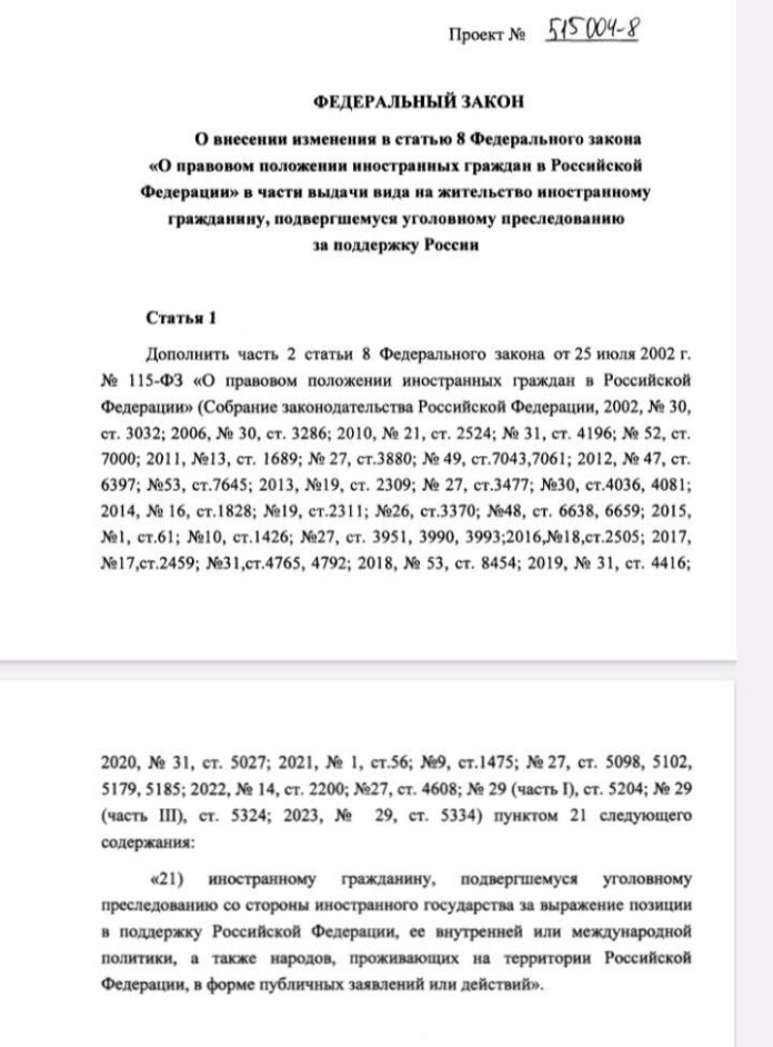 Вид на жительство в России смогут получить иностранцы, которые подверглись уголовному преследованию за «выражение позиции в поддержку России, ее внутренней или международной политики и гражданам РФ», сообщается в пояснительной записке к законопроекту: