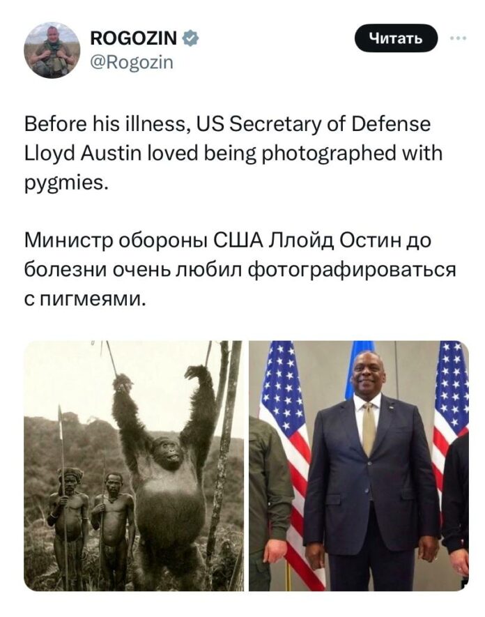 Экс-глава «Роскосмоса», а ныне сенатор от аннексированной «Запорожской области» Дмитрий Рогозин опубликовал в соцсети X твит с двумя фотографиями: Владимира Зеленского, министра обороны Украины Рустема Умерова с министром обороны США Ллойдом Остином, а также фото пигмеев с пойманной гориллой в Конго. «Министр обороны США Ллойд Остин до болезни очень любил фотографироваться с пигмеями», — написал Рогозин.