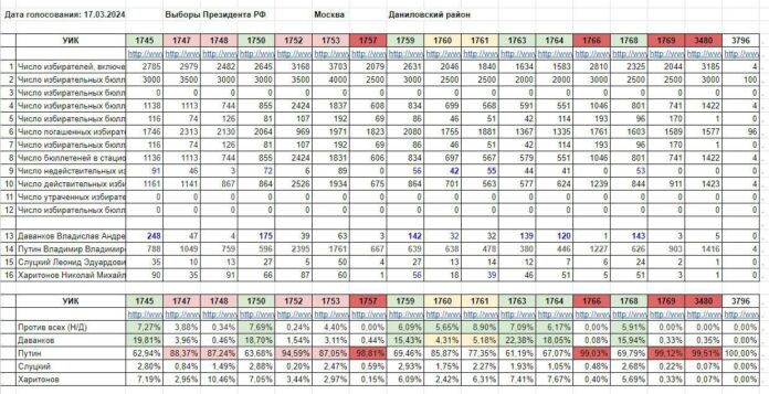 Аномальные, сравнимые с чеченскими, результаты выборов обнаружены почти в центре Москвы в Даниловском районе. На тех УИКах, где были независимые наблюдатели, Путин набирал чуть больше 60%. Но буквально на соседних участках за инкумбента якобы проголосовали 98-99% от пришедших (отмечены красным в таблице).