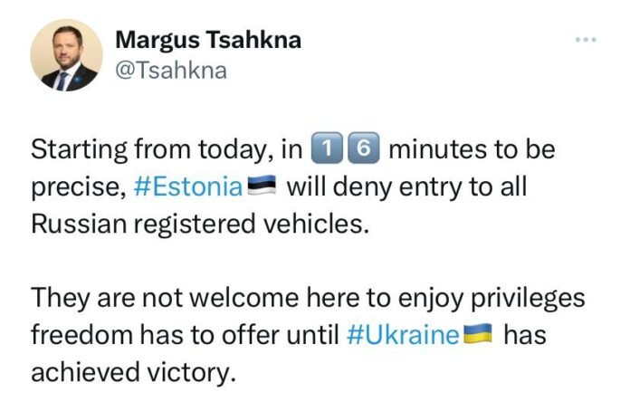 «Их [россиян] здесь не ждут, чтобы они могли пользоваться привилегиями свободы, пока Украина не добьется победы», — сообщил министр иностранных дел Эстонии Маргус Цахкна.