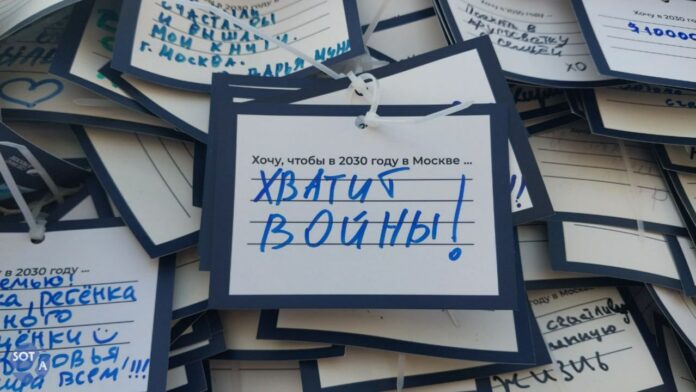Некоторые посетители сегодняшнего паблик-тока «Москвичка» оставили на листках, на которых можно было поделиться своим видением будущего в Москве, антивоенные надписи. Люди написали, что в 2030 хотели бы видеть Москву мирным и спокойным городом, и призвали прекратить войну и открыть границы.