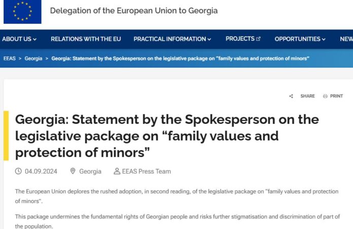 В представительстве ЕС считают, что принятие закона «подрывает основные права грузинского народа и создает угрозу дальнейшей стигматизации и дискриминации части населения».