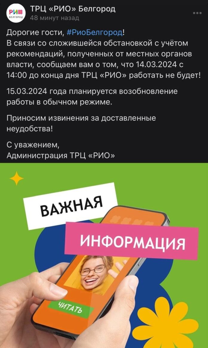 «Самое главное — это вопрос безопасности. Было много обращений от вас закрыть торговые центры. Это мы уже фактически сделали — они сейчас закрываются. Мы договорились, что пока до конца дня. В последующие дни все будет зависеть от оперативной обстановки», — прокомментировал ситуацию губернатор Вячеслав Гладков.