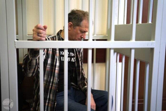 На Романе футболка «Уже 2 года. Еще 6 лет». Журналист уже год провел за решеткой в ожидании приговора.