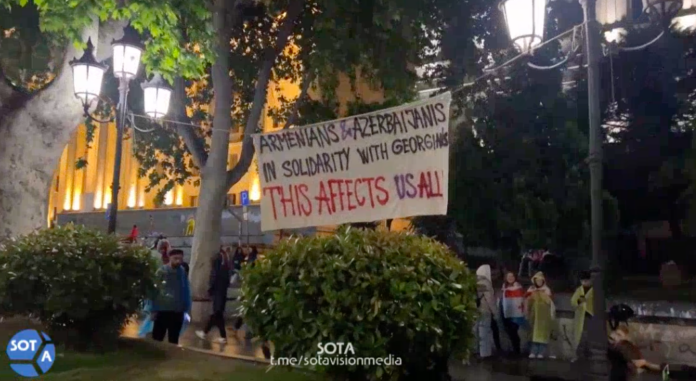 К протестам в Грузии присоединились жители Армении и Азербайджана. Они принесли на митинг плакат с надписью «Армяне и азербайджанцы солидарны с гражданами Грузии. Это влияет на нас всех!»