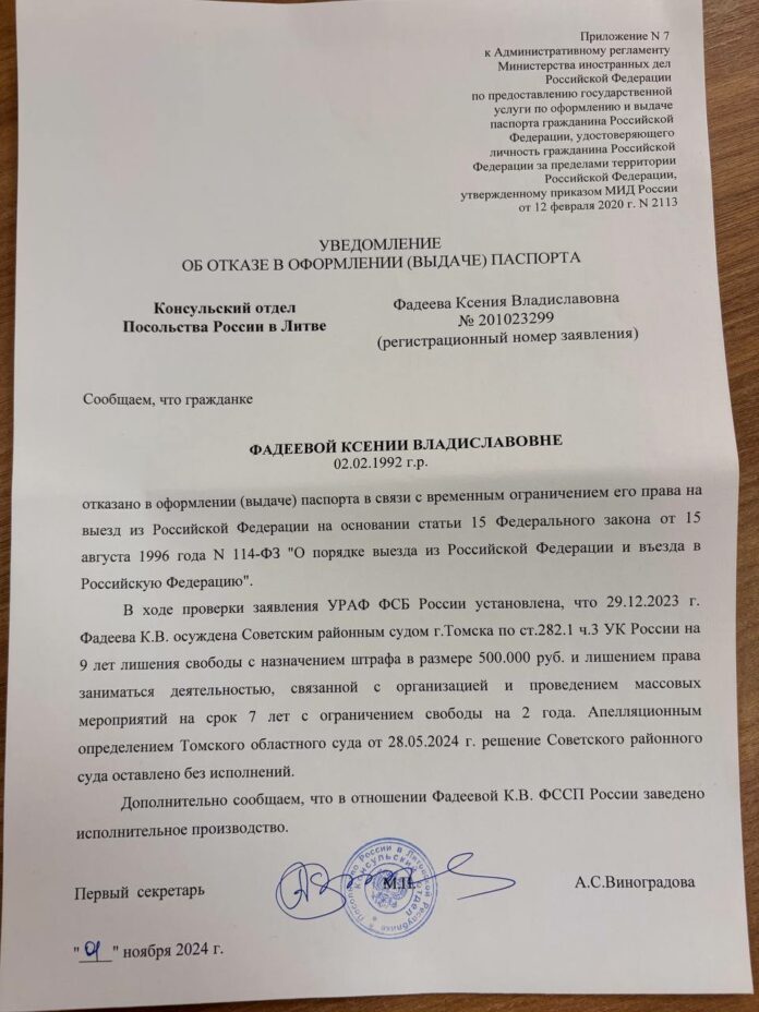 В отказе сказано, что Фадеевой не могут выдать загранпаспорт, потому что ее приговорили к лишению свободы.