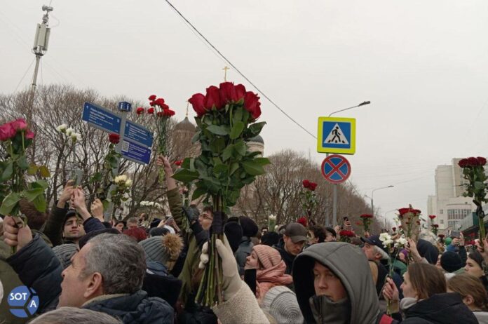 Люди идут в сторону Борисовского кладбища, подняв вверх цветы. У одного человека также замечен плакат «Не сдавайтесь»
