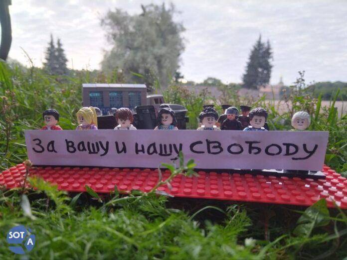 Маленький, но протест. В Петербурге на Марсово поле «вышли» митингующие фигурки «Лего» с плакатом «За вашу и нашу свободу»