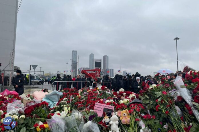 В настоящий момент поток людей такой большой, что полицейским пришлось перегородить проход. Волонтеры заняты перекладыванием цветов, передает наш корреспондент.