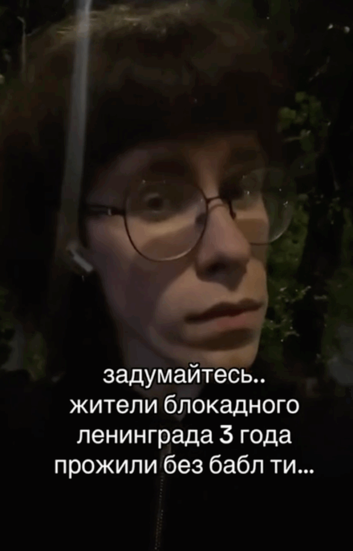 В ролике Костюков просто идет по улице, но на экране в этот момент появляется надпись: «Задумайтесь.. жители блокадного Ленинграда 3 года прожили без бабл-ти…».
