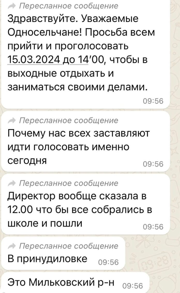 НовостиНа Камчатке бюджетников заставляют проголосовать сегодня до 14:00, «чтобы в выходные отдыхать... Новости На Камчатке бюджетников заставляют проголосовать сегодня до 14:00, «чтобы в выходные отдыхать и заниматься своими делами» Sota Vision 15.03.2024 30 Поделиться TwitterTelegramFacebookPinterestWhatsAppCopy URL Скриншот: член Камчатского отделения КПРФ Илья Быков По данным камчатского избиркома, по состоянию на 15 часов на участках проголосовало больше трети всех избирателей края. Поделиться TwitterTelegramFacebookPinterestWhatsAppCopy URL Предыдущая статьяВласти отчитываются о рекордной явке в первый день президентского голосованияСледующая статьяИлья Яшин дал свои рекомендации по поводу начавшегося голосования ЧИТАТЬ ЕЩЕ Новости Украина готова провести выборы в течение 60-90 дней при поддержке США и ЕС — Зеленский 09.12.2025 Новости На активистку Сашу Казанцеву составили два протокола о «пропаганде ЛГБТ» 09.12.2025 Новости Кремлеботы атаковали Мизулину после критики блокировки Roblox 09.12.2025 Популярное Украина готова провести выборы в течение 60-90 дней при поддержке США и ЕС — Зеленский 09.12.2025 На активистку Сашу Казанцеву составили два протокола о «пропаганде ЛГБТ» 09.12.2025 Кремлеботы атаковали Мизулину после критики блокировки Roblox 09.12.2025 «Как человек проживает свою единственную жизнь в закрытой системе» — в Москве открылась выставка, посвященная жизни в ПНИ 09.12.2025 Загрузить больше