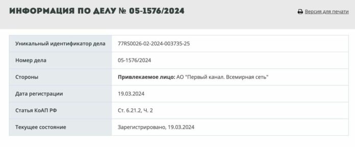НовостиНа Первый канал составили протокол о неправильной возрастной маркировке ЛГБТ-контента, обратила внимание... Новости На Первый канал составили протокол о неправильной возрастной маркировке ЛГБТ-контента, обратила внимание «Медиазона» Sota Vision 19.03.2024 26 Поделиться TwitterTelegramFacebookPinterestWhatsAppCopy URL Материалы дела зарегистрировали сегодня в Таганском суде Москвы. Поделиться TwitterTelegramFacebookPinterestWhatsAppCopy URL Предыдущая статьяЗа неделю обстрелов в Белгородской области погибли 16 человек, пострадали еще 98 — губернатор ГладковСледующая статьяВ Шебекино Белгородской области найдены фальсификаторы-перфекционисты ЧИТАТЬ ЕЩЕ Новости Подозреваемых в попытке похищения футболиста Александра Мостового арестовали на 2 месяца 27.10.2025 Новости В Грозном может появиться Путинский суд 27.10.2025 Новости Журналистку Татьяну Монтян объявили «экстремистом» 27.10.2025 Популярное «Швейка, промка, дурогоны». Российские политические заключенные рассказывают о системе труда в колониях 30.10.2025 Гитариста «стоптайм» Александра Орлова повторно задержали на выходе из спецприемника 27.10.2025 Блогера-пацифиста Вегана Христолюба перевели в колонию и сразу дважды подряд поместили в ШИЗО 27.10.2025 Подозреваемых в попытке похищения футболиста Александра Мостового арестовали на 2 месяца 27.10.2025 Загрузить больше