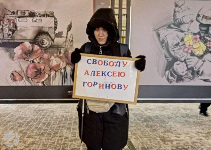 Незрячая активистка Оксана Осадчая провела одиночный пикет, требуя свободы для депутата, осужденного за антивоенные лозунги.