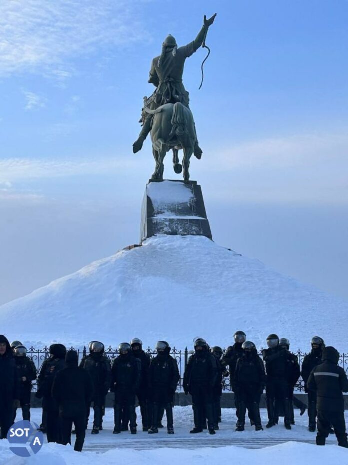 Силовики предупреждают в мегафон об ответственности за участие в несанкционированной акции, но на претензии сотрудников в форме отвечают: «Мы туристы, пришли на памятник посмотреть».