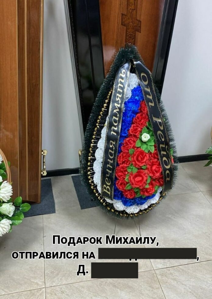 На венках именная черная лента с подписью «От Рейда», а к венку приложена открытка с «последним предупреждением». Послания адресованы сотрудникам оборонного предприятия «Аэроскан», которое последние годы занимается производством боевых дронов.