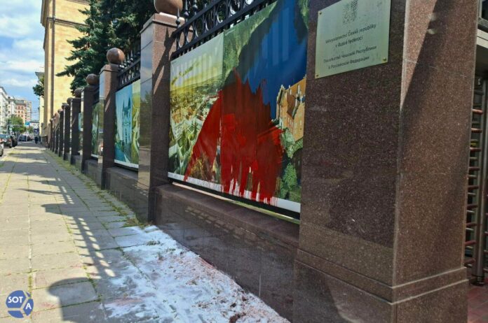 Стены у входа в посольство Чешской Республики на улице Юлиуса Фучика облили красной краской. Утром на турникете на входе висел флаг США, также измазанный краской. Сейчас его убрали.