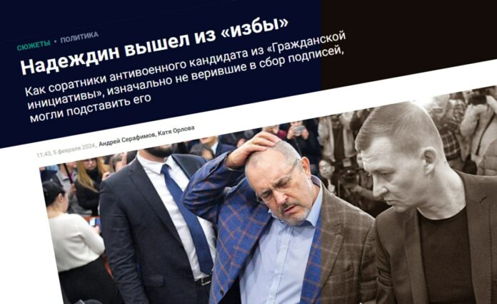 Спустя примерно полчаса на сайте «Новой Газеты Европа» вышла публикация за авторством Андрея Серафимова и Кати Орловой, в которой найденный брак объясняется тем, что в ЦИК «могли быть отправлены грязные подписи», а Надеждина «могли подставить» его соратники. Также в статье утверждается, что имела место «массовая рисовка подписей», а десятки тысяч подписей не прошли надлежащие проверки из-за конфликтов и плохой координации между «разными штабами». Все эти утверждения обосновываются ссылками на мнения нескольких анонимных источников из числа волонтеров и сотрудников штабов Надеждина. И… больше ничем.