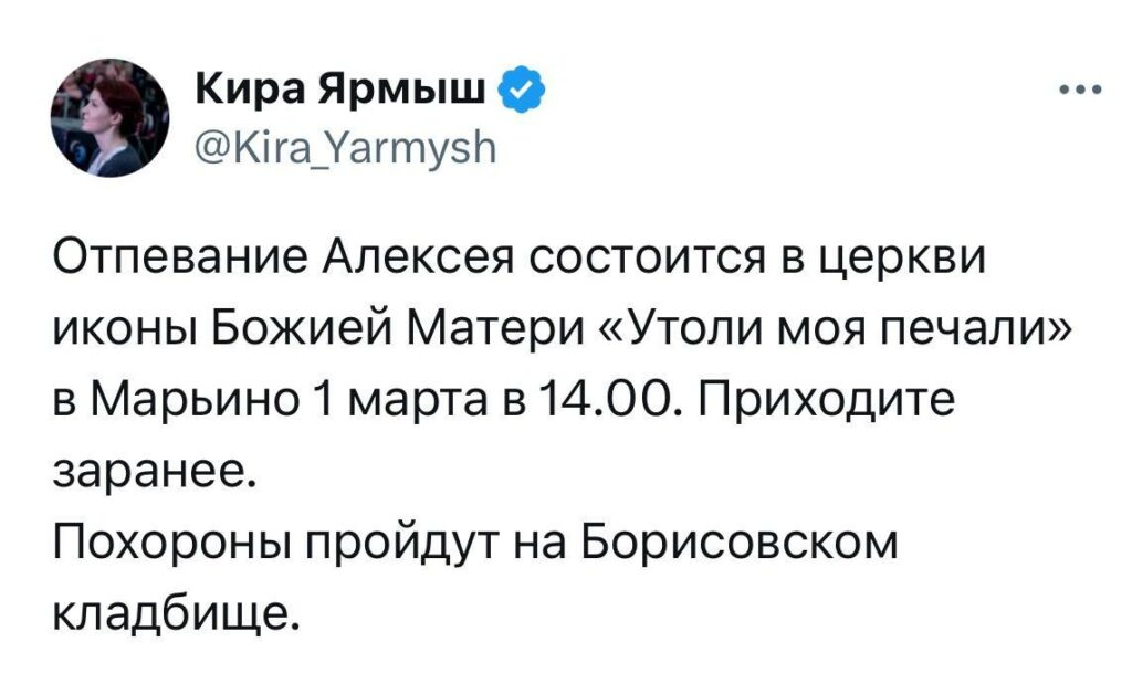ГлавноеОтпевание Алексея Навального состоится 1 марта в церкви иконы Божией Матери «Утоли... Главное Отпевание Алексея Навального состоится 1 марта в церкви иконы Божией Матери «Утоли моя печали» в Марьино Sota Vision 28.02.2024 94 Поделиться TwitterTelegramFacebookPinterestWhatsAppCopy URL архив SOTAvision / Антонина Фаворская Об этом сообщила пресс-секретарь политика Кира Ярмыш. Похороны пройдут на Борисовском кладбище. Поделиться TwitterTelegramFacebookPinterestWhatsAppCopy URL Предыдущая статья2 года колонии запросил прокурор для кировской активистки за оскорбление «военкора» Владлена Татарского — «7х7»Следующая статьяДепутатам-единороссам в Долгопрудном не хватило одного голоса, чтобы изменить избирательную систему на выборах в местный совет депутатов ЧИТАТЬ ЕЩЕ Главное Уличной артистке из Перми назначили 60 часов обязательных работ из-за концерта в поддержку «стоптайм» 06.11.2025 Главное Льва Шлосберга приговорили к 420 часам обязательных работ из-за репостов видео в «ВК» без плашек «иноагента» 05.11.2025 Главное В Перми уличную артистку арестовали на семь суток по делу об «отказе от освидетельствования на наркотическое опьянение» 03.11.2025 Популярное «Американские выборы лучше предсказывать, гадая на кофейной гуще и с картами Таро»: эксперты о победе демократов на местных выборах в США и перспективах кампании... 08.11.2025 От колонии до Вильнюса: истории освобожденных белорусских узников, вывезенных в Литву 07.11.2025 В Риге 10 тысяч человек вышли на улицу против отказа Латвии от конвенции о борьбе с домашним насилием 06.11.2025 Активистку Зульфию Ситдикову повторно приговорили к 10 суткам ареста за возложение цветов к мемориалу жертвам политических репрессий 06.11.2025 Загрузить больше