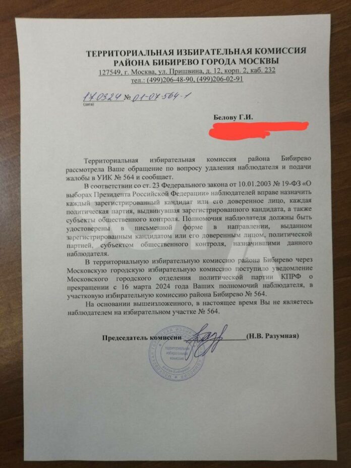 В последний день голосования наблюдателя Георгия Белова удалили с участка. Эти действия он обжаловал в территориальной избирательной комиссии. В удовлетворении жалобы ТИК отказал, предоставив документ от КПРФ об отзыве Белова.