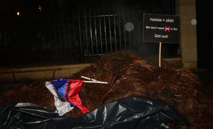 В груду навоза воткнули флаг России и табличку с подписью «„russia = shit“: Мы не хотим вас в ЕС! Проваливайте!».