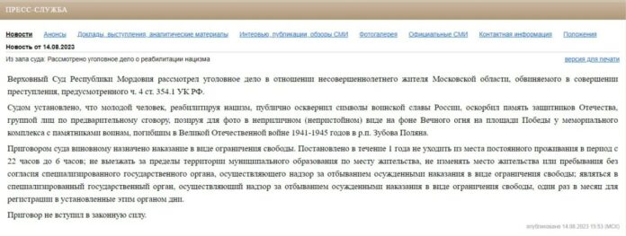 Информационно-аналитический центр «Сова» обратил внимание на опубликованную на сайте Верховного суда Республики Мордовия информацию, согласно которой 17-летний подросток осужден за осквернение символов воинской славы (ч. 4 ст. 354.1 УК).