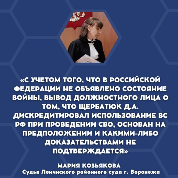 НовостиПомните мы рассказывали про «судью здорового человека» Марию Козьякову из Воронежа, которая прекратила... Новости Помните мы рассказывали про «судью здорового человека» Марию Козьякову из Воронежа, которая прекратила дело активиста, вышедшего с плакатом «Остановите войну»? Sota Vision 06.07.2023 69 Поделиться TwitterTelegramFacebookPinterestWhatsAppCopy URL На днях вышло постановление суда, которое, по нашему мнению, должно лечь в основу практик по аналогичным делам. Поделиться TwitterTelegramFacebookPinterestWhatsAppCopy URL Предыдущая статьяСуд в Петербурге оставил под стражей 16-летнего гимназиста поджигателя военкомата Егора БалазейкинаСледующая статьяПрокуроры в Уфе запросили ужесточение наказания для Лилии Чанышевой и хотят увеличить ей срок с 7 до 10 лет ЧИТАТЬ ЕЩЕ Новости «Осторожно, новости»: из ереванской квартиры убитой Айшат Баймурадовой выходил чеченец, которого обвиняли в финансировании «Исламского государства» 03.11.2025 Новости Военного, убившего в Новой Таволжанке мужчину и изнасиловавшего его жену, подозревают в новом убийстве 03.11.2025 Новости В Риге прошел пикет против блокировок счетов россиян в Revolut 03.11.2025 Популярное «Осторожно, новости»: из ереванской квартиры убитой Айшат Баймурадовой выходил чеченец, которого обвиняли в финансировании «Исламского государства» 03.11.2025 Военного, убившего в Новой Таволжанке мужчину и изнасиловавшего его жену, подозревают в новом убийстве 03.11.2025 Задержанного посетителя «Некрокомиккона» арестовали на 12 суток за книгу «Сатанинские ритуалы» 03.11.2025 Юрий Шевчук поддержал музыкантов «стоптайм» на концерте в Лондоне 03.11.2025 Загрузить больше