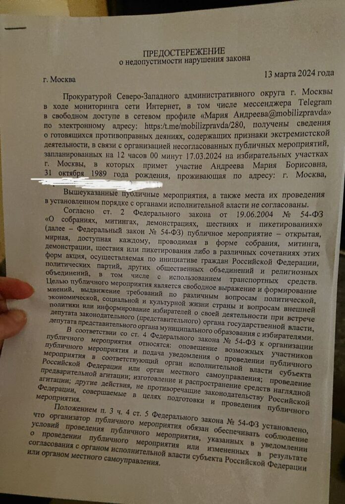 Предостережение активистке движения жен мобилизованных «Путь домой» Марии Андреевой полиция выписала из-за ее призыва не голосовать за Путина