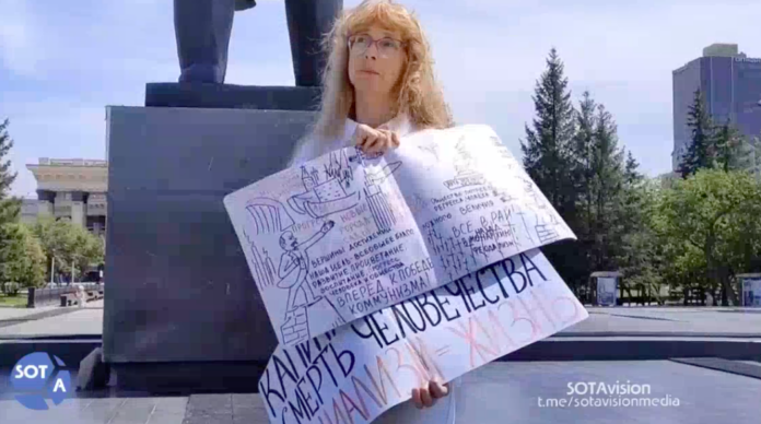 Активистка Елена Юн вышла с пацифистским плакатом «Капитализм = война человечества».