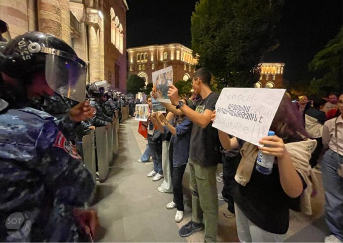 Активисты показали силовикам фото и плакаты со словами о геноциде армян, затем наклеили на полицейские щиты стикеры с флагом Республики Арцах.