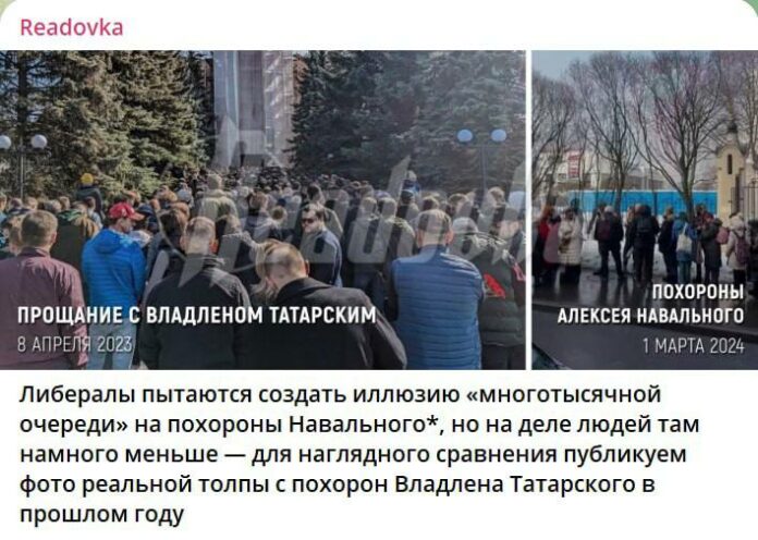 Журналисты Readovka написали, что «катафалк с телом Алексея Навального несколько задержался, что и создало временный эффект скопления народа, однако на деле людей там собралось намного меньше, чем пытаются представить это русофобы». По их мнению, на похороны того же Татарского собралось гораздо больше людей без какой-либо «раскрутки, режиссерских ходов, нагнетания обстановки и фейковых приманок». Для доказательства этой точки зрения журналисты опубликовали обрезанную фотографию с похорон Навального с ракурса, который не демонстрирует настоящий масштаб.