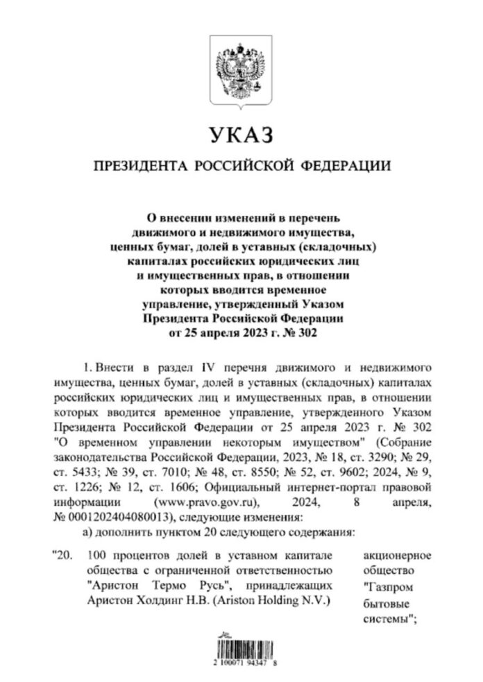 НовостиПутин передал российские «дочки» Ariston и Bosch «Газпрому» Новости Путин передал российские «дочки» Ariston и Bosch «Газпрому» Sota Vision 26.04.2024 12 Поделиться TwitterTelegramFacebookPinterestWhatsAppCopy URL Соответствующий указ появился на портале для опубликования официальных актов. Под «временное управление» «Газпром бытовые системы» переданы все 100% акций обоих юрлиц. Поделиться TwitterTelegramFacebookPinterestWhatsAppCopy URL Предыдущая статьяВернувшийся с фронта боец «СВО» зарезал знакомого, не оценившего его армейские достиженияСледующая статьяСуд в Калининграде отказался истребовать видео с издевательствами над шведским активистом во время обыска ЧИТАТЬ ЕЩЕ Новости Подозреваемых в попытке похищения футболиста Александра Мостового арестовали на 2 месяца 27.10.2025 Новости В Грозном может появиться Путинский суд 27.10.2025 Новости Журналистку Татьяну Монтян объявили «экстремистом» 27.10.2025 Популярное Гитариста «стоптайм» Александра Орлова повторно задержали на выходе из спецприемника 27.10.2025 Блогера-пацифиста Вегана Христолюба перевели в колонию и сразу дважды подряд поместили в ШИЗО 27.10.2025 Подозреваемых в попытке похищения футболиста Александра Мостового арестовали на 2 месяца 27.10.2025 В Грозном может появиться Путинский суд 27.10.2025 Загрузить больше