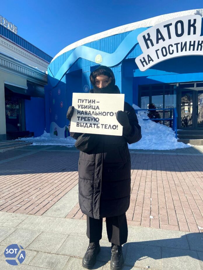В Гостином дворе города Уфы прошел пикет с требованием выдать тело Алексея Навального его родственникам. Девушку с пикета забрали в отдел полиции.