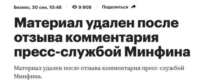 Утром РБК опубликовал материал, о приобретении «Сбером» государственного пакета акций киностудии «Союзмультфильм», ссылаясь на пресс-службу Минфина. Сейчас на сайте издания написано, что материал удален после отзыва комментария пресс-службы.