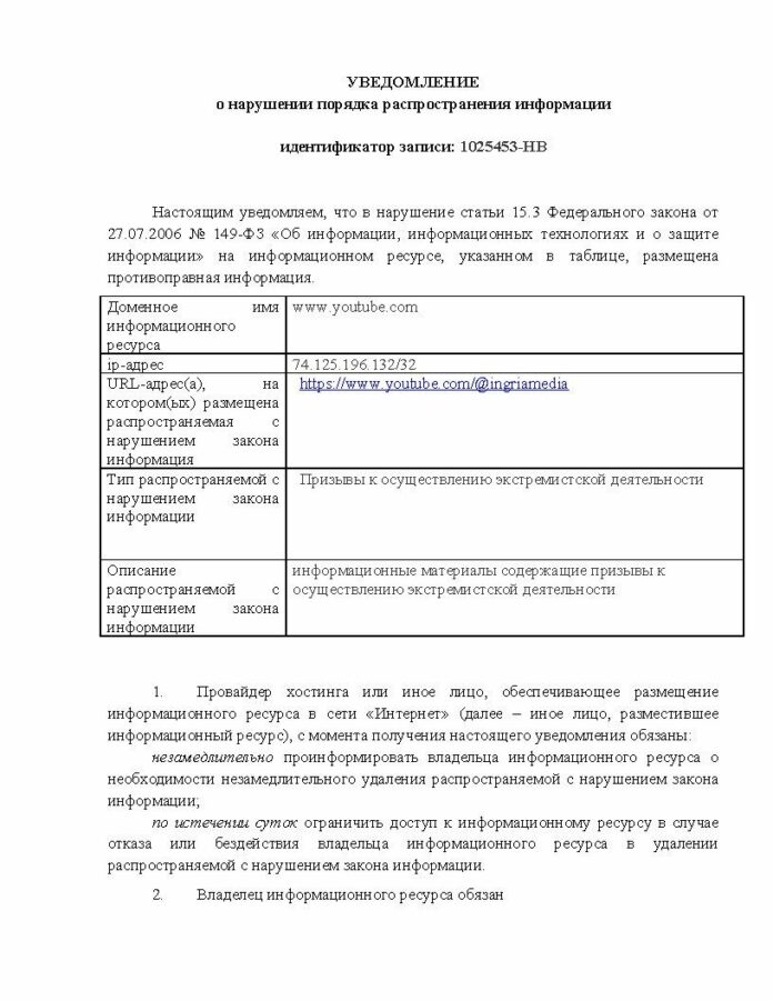 Материалы опубликованные изданием в видеохостинге якобы нарушают Федеральный закон РФ№ 149-ФЗ «Об информации, информационных технологиях и о защите информации». В письме Google отметили, что об этом их уведомили Роскомнадзор, который внес ролики «Ингрии без границ» в запрещенный список материалов. Также, они добавили, что «если редакция не удалит контент, то компания будет вынуждена его заблокировать».
