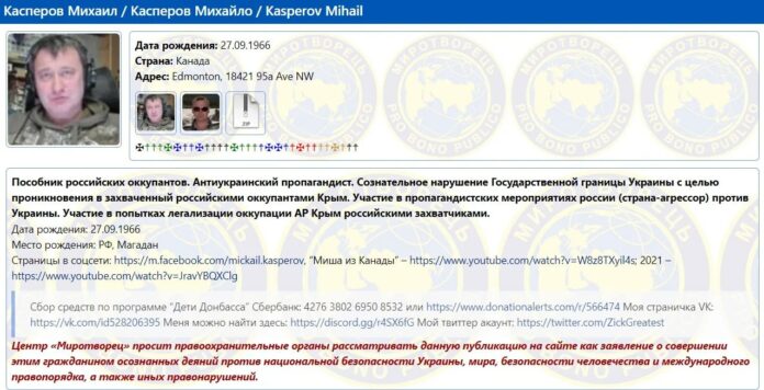 Михаил Касперов — фигурант списка «Миротворец». Он оправдывал аннексию Крыма и агрессию России в Украине, занимался сбором средств для российских военных и способствовал травле проукраински настроенных крымчан.