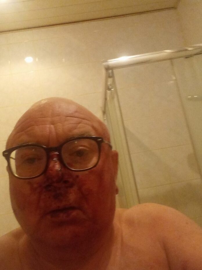 «И другого новогоднего подарка у меня для вас нет. Разбитая харя «пидора», избитого во дворе на Патриках», — сообщил он на своей странице в Facebook, приложив фотографии со своим окровавленным лицом.