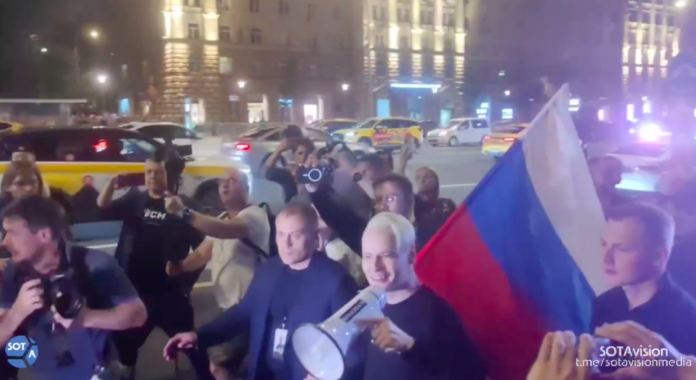 Шаман появился в толпе с мегафоном и флагом России на плече.